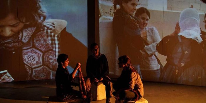 Die Zusammenarbeit mit den ezidischen Menschen vor Ort und in der Diaspora war der Regisseurin Anina Jendreyko von Anfang an enorm wichtig. Während der Texterarbeitung stand sie im intensiven Austausch mit dem eezidischen Frauendachverband und einzelnen Ezidinnen, die als Geflüchtete in Deutschland und in der Schweiz leben. Für sie alle war es das erste Mal, dass sie mit ihrer eigenen Geschichte in einen künstlerischen Prozess eingebunden waren. Drei Stränge sind in der Inszenierung ineinander geflochten worden: Die Live-Musik kurdisch-ezidischer Musikerinnen und Musiker, die im Şengal gedrehten Video- und Tonbandaufnahmen sowie Text und Spiel der Schauspieler*innen. Neben der Figur Feride, die von einer ezidischen Schauspielerin gespielt wird, befinden sich zwei weitere Schauspielerinnen und ein Schauspieler auf der Bühne. Fast alle auf der Bühne haben einen biographischen Bezug: sie kommen aus kurdischen Gebieten, ihre Eltern und Großeltern wurden zum Islam zwangskonvertiert, sie sind Gastarbeiterkinder oder politisch Geflüchtete, weil sie wegen ihrer künstlerischen Tätigkeit verfolgt wurden.